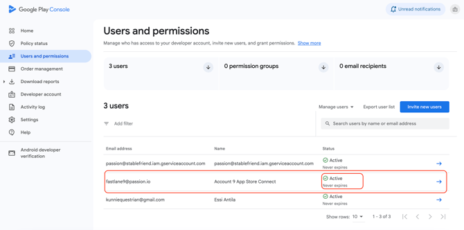 - From your Google Play Console Click on Users and permissions.